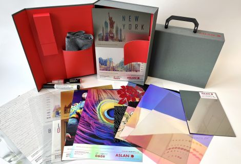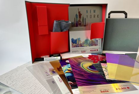Die ASLAN Boardbox beinhaltet über 30 ausgewählte Folien made in Germany auf insgesamt 17 DIN-A4-Platten: von gebürstetem Metalleffekt über holografische, glitzernde und beflockte Folien bis hin zu ColourShift-Effekten. Jede Folie ist sofort vorführbereit und ermöglicht Ihren Kunden, die besondere Qualität und Vielfalt der ASLAN-Folien unmittelbar zu erleben.