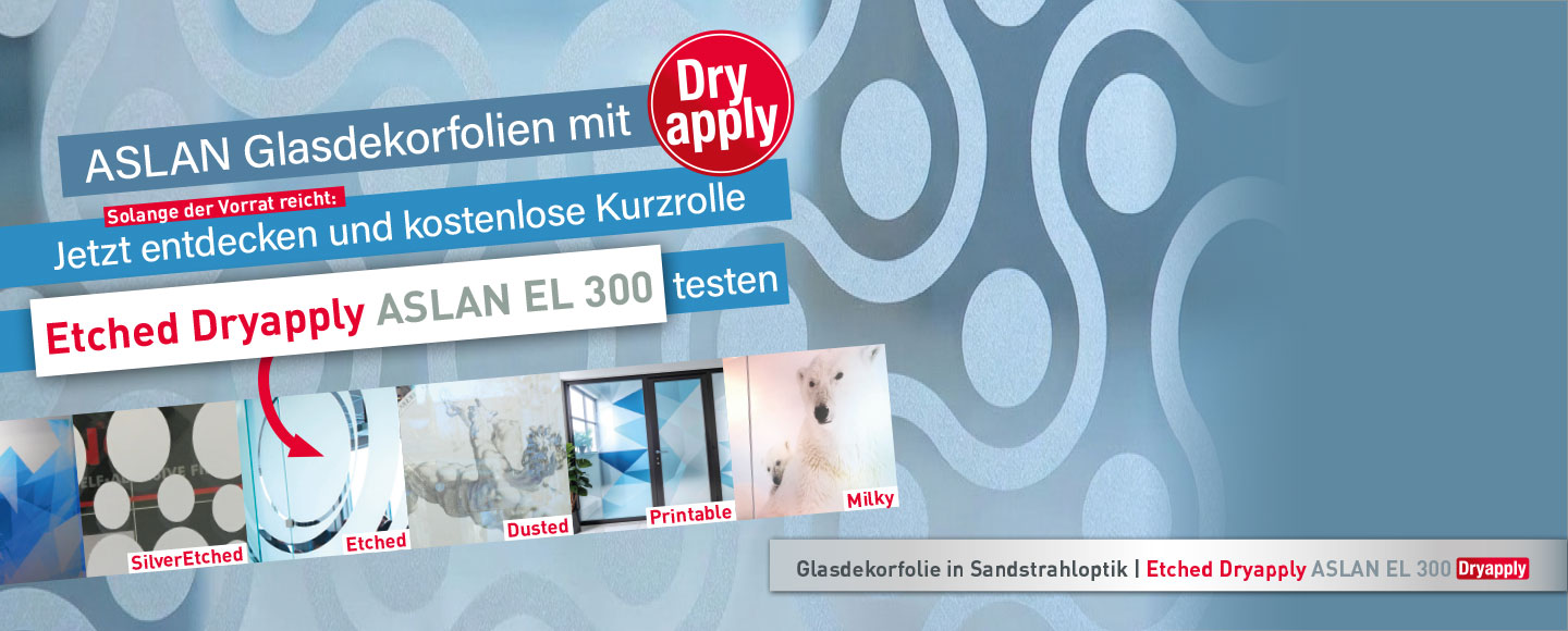Nur wer sie selbst verarbeitet hat, lernt die großen Vorteile zu schätzen. Die Glasdekorfolien mit der bewährten ASLAN Dryapply-Technologie sind im Markt bekannt und beliebt. Nutzen Sie jetzt die Möglichkeit, eine kostenlose Kurzrolle zum Test zu bestellen und überzeugen Sie sich selbst von der hochwertigen Oberfläche, der überlegenen Klebstoffstruktur und der besonders einfachen Applikation.