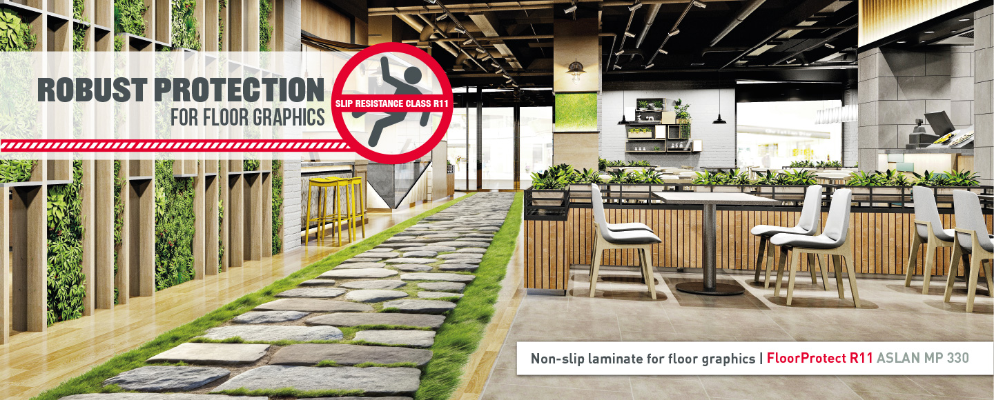 The flawless appearance and optimised lifespan of floor graphics are essentially depending on suitable, perfectly matched laminates. They not only protect the walkable digital print but also offer slip resistance due to the rough surface, which is essential in public areas in particular. Today we are introducing our new protective laminate for floor graphics with R11 classification: FloorProtect R11 ASLAN MP 330