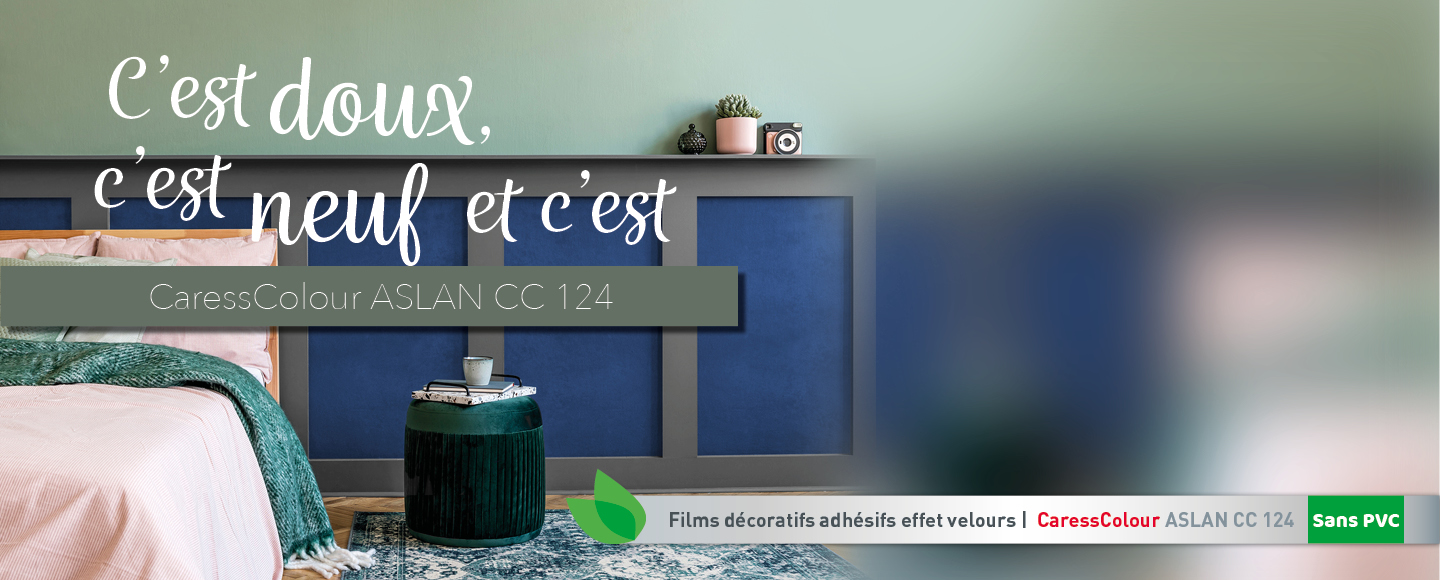 L'année commence tout en douceur – avec le nouveau CaressColour ASLAN CC 124, un film adhésif décoratif effet velours en 15 couleurs. La finition de surface de velours crée des effets optiques et haptiques pour des applications en surface pleines ou des visuels de découpe.