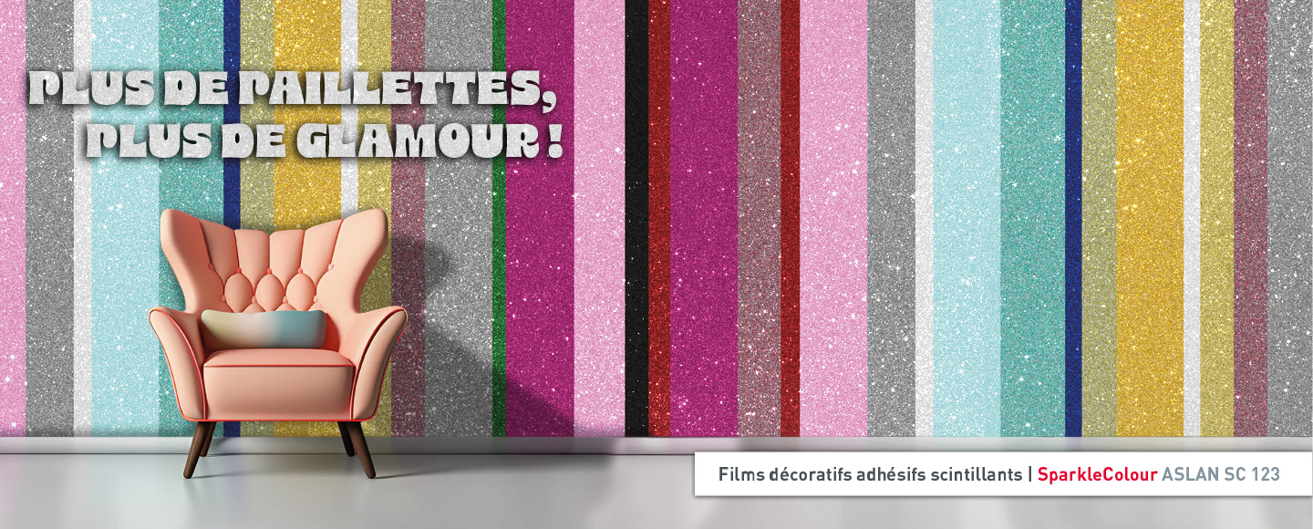 Pour vous mettre des paillettes dans les yeux, il vous fallait plus de couleurs ! Nous avons donc décidé d'élargir considérablement la gamme de couleurs du film adhésif pailleté SparkleColour ASLAN SC 123 et proposons désormais 14 couleurs standard.