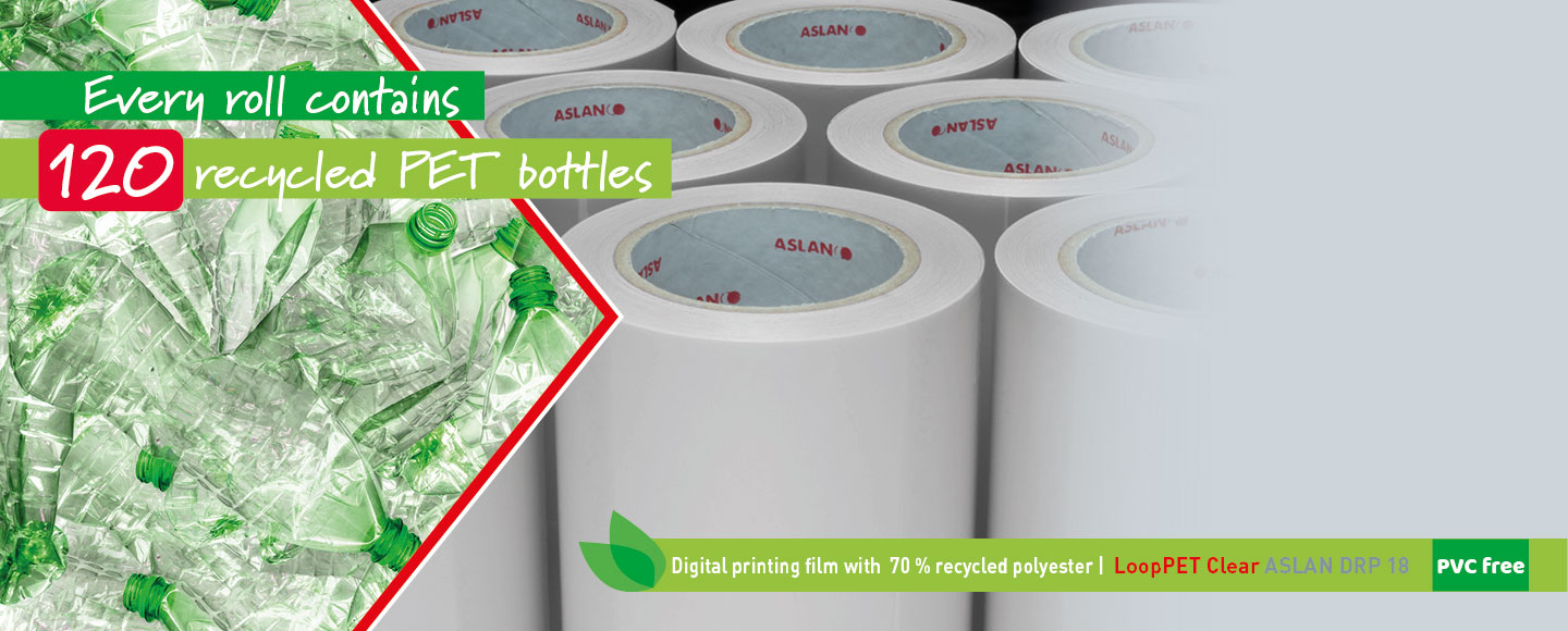Brand new on stage: The transparent, glossy digital printing film LoopPET Clear ASLAN DRP 18. Like its two siblings, it is made of recycled polyester (recycled content 70%) and has a water-based adhesive. It is suitable for bonding on flat surfaces both indoors and outdoors and can be printed with latex and UV curable inks. The external durability of three years also adds to its sustainability.