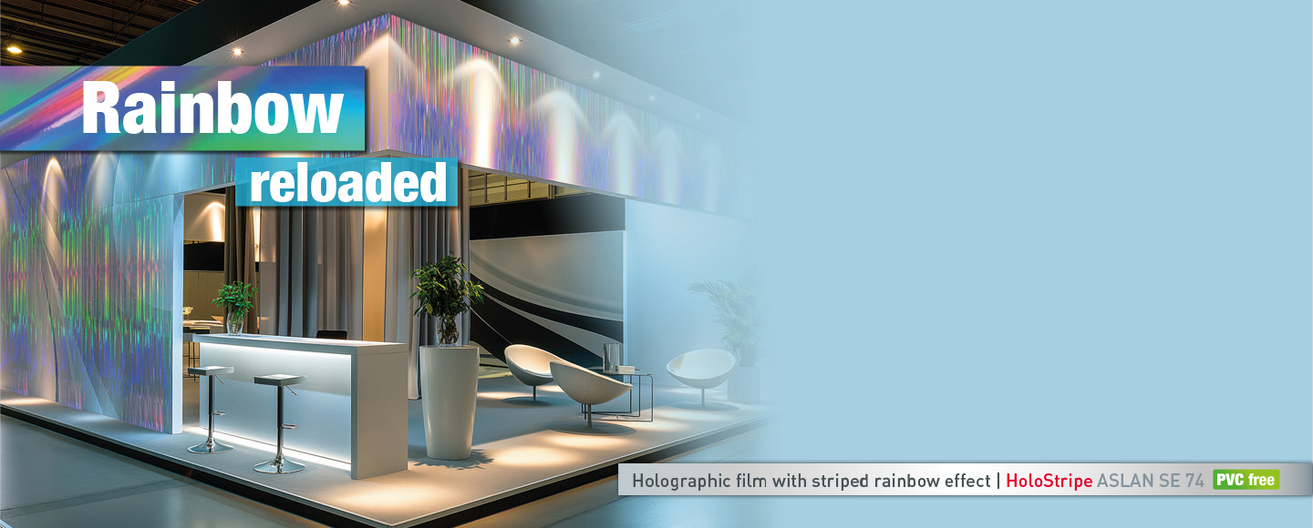 From now on, this new effect film is sure to spark conversations – in the best sense of the word: HoloStripe ASLAN SE 74 combines the shimmering rainbow effect of the well-known Holographic ASLAN SE 72 with an elegant striped pattern, bringing fresh momentum to shop windows, trade fair stands, and event designs.